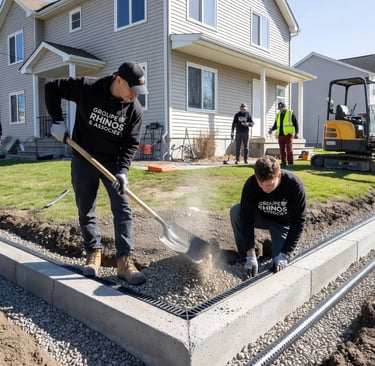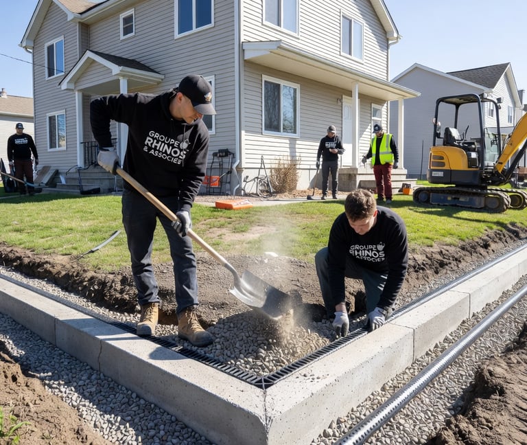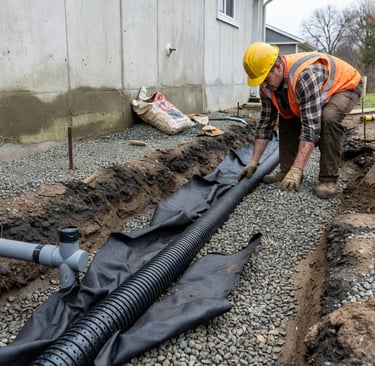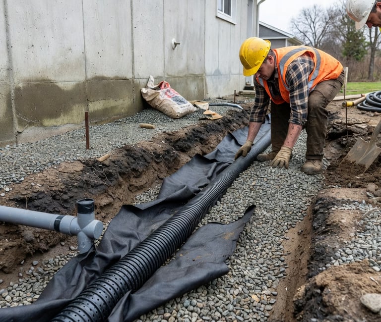 Drains français paysagers : Installation bord de maison invisible – gravier, tuyaux perforés, géotextile. Protège contre érosion/inondations + finition verte impeccable.